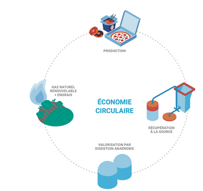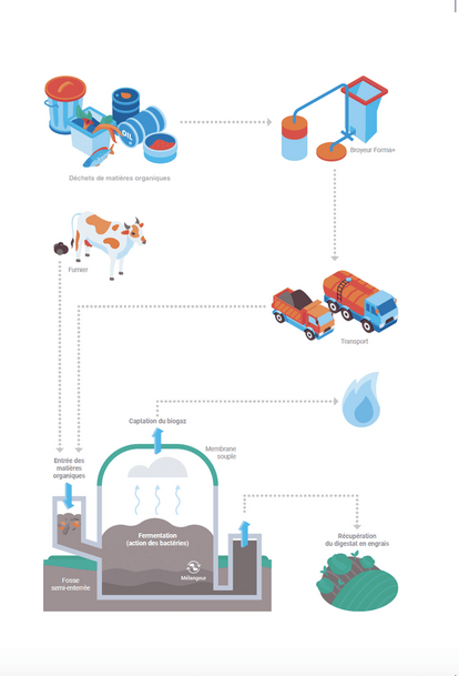 - LA PRODUCTION - Les déchets de matières organiques sont acheminés vers un biodigesteur pour être transformés en biogaz. Ce biogaz est purifié pour produire un gaz parfaitement interchangeable avec le gaz naturel. Le processus génère aussi un digestat écologique, organique et 100 % naturel, pouvant être utilisé comme fertilisant.